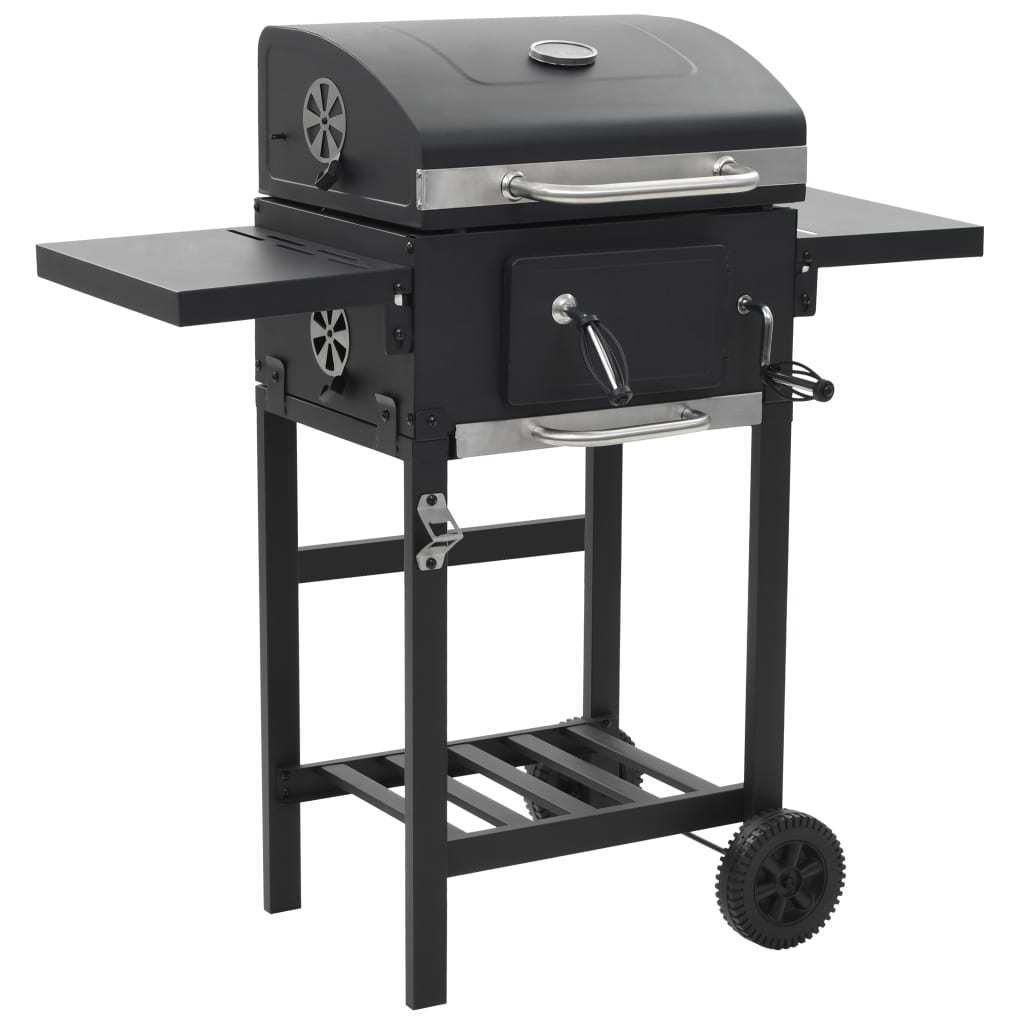 Using charcoal as fuel, this barbecue grill is suitable for grilling, broiling and smoking. You can monitor the temperature in the chamber with the integrated thermometer on the hood. Thanks to the powder-coated steel body, our barbecue grill has a sleek and stylish design and is very durable. It has 2 pieces of enamelled cooking grid and a heavy-duty hood. Two foldable side tables offer additional space for creating sauces or your favorite side dishes. Equipped with 2 castors, this grill is easy to move around. This barbecue grill will surely be an indispensable part for your outdoor activities!Color: BlackMaterial: Powder-coated steelOverall dimensions: 38.2" x 22.4" x 39" (W x D x H)Cooking area size: 16.9" x 12.6" (L x W)Height of cooking area from the ground: 32.3"Height adjustable charcoal trayWith an integrated thermometerWarming rack includedWith bottle openerWith bottom shelfFoldable side tablesWith 2 sturdy castors for mobilityWARNING There may be local legal requirement about using this product. Please follow the legal requirement.